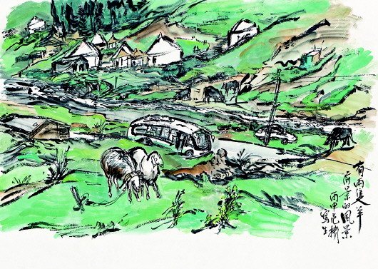 ▲有两只羊前景的风景 55×78cm 范扬