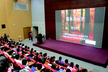 讲座以历史变迁和时代发展为角度,结合中国地图为演讲轴讲述了我国森林生态的概况。赵士洞以“一只小蚂蚁在苹果上爬来爬去,无从下口,但只要为它掀开一点苹果皮,小蚂蚁尝到了苹果的甜头,就会高兴地钻进去。”这样的比喻诠释了科普理念:“科学知识就好比这个又大又红的苹果,科学家就是要做掀开苹果皮的人,引导青少年们去品尝科学知识的美味。”