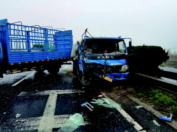28日,在青银高速公路潍坊段上,一辆满载货物的烟台牌照大货车,由于跟车太近,加上路面湿滑,刹车不及与前方一辆潍坊牌照的大货车相撞,副驾驶人员受伤。
