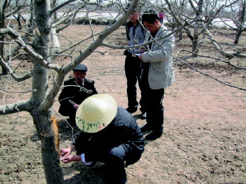 果树病虫防治 日前,沂源县鲁村镇成教中心学校党支部与镇林果站联合组织党员干部进村入户指导果农积极做好果树病虫害防治工作。该镇果技专家将课堂“搬”上了果园。