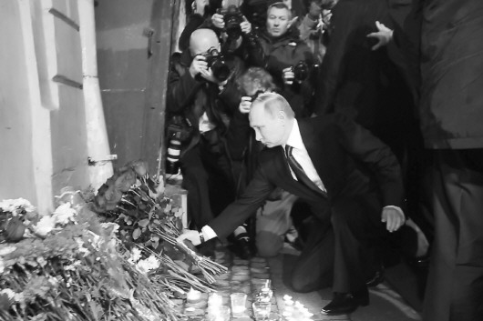 爆炸事件发生时,俄罗斯总统普京正在圣彼得堡郊区与白俄罗斯总统卢卡申科举行会谈。他3日晚到地铁“技术学院站”前献花,哀悼遇难者。电视画面显示,普京走到地铁站前,将手中鲜花放在鲜花和蜡烛丛中,默哀后离开现场。