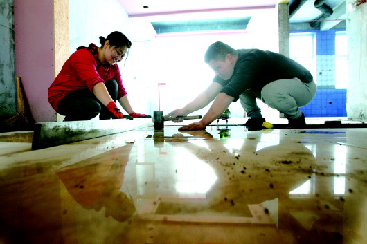 丈夫用皮锤不停地敲击地砖找平,妻子则在一旁用靠尺检查平整度。这对瓦工夫妻,一个切砖贴砖,一个和泥和沙,活干得也是越来越好。他们每天可以赚到600多元,夫妻俩用自己的双手拼出了20万元的年薪。