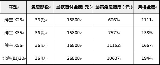 依据政策,在活动期间,凡贷款购买绅宝X25/X35/X55/北京(BJ)20的用户,仅需支付部分首付,均可尊享3年36期超长免息优惠,按照目前5.25%的贷款基准利率计算,最高可省11152元!