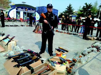 4月13日上午,东港公安分局在东港区政府广场,集中展示去年开展缉枪治爆专项行动以来缴获的各类枪支和管制刀具。展示结束后,缴获的枪支和管制刀具全部被拉至日照钢铁控股集团有限公司的转炉工场集中销毁。