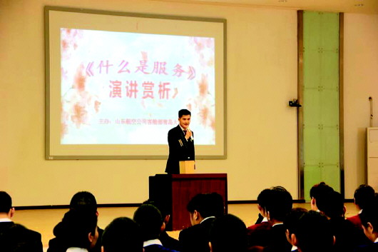 4月12日,山航客舱部青岛大队组织“什么是服务”主题讲演赏析。山航客舱部副总经理华榜榜,青岛大队全体干部,以及当日无飞行任务的乘务员参加活动,以深入落实山航2017年服务质量规范与提升专项行动方案,进一步提高服务品质,增进旅客对真情服务的获得感。