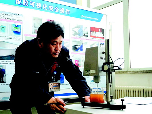 张新宝对配胶进行检测。