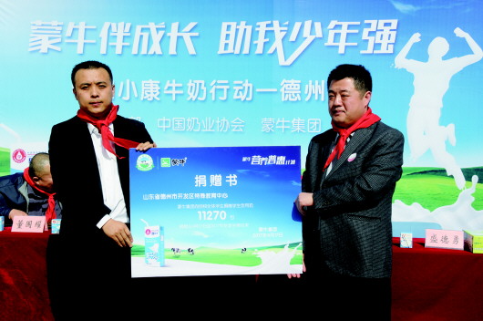 4月17日下午,“中国小康牛奶行动”德州站的助学捐赠仪式在德州市特殊教育中心举行。蒙牛集团自4月17日起至2017年秋季学期结束,将向德州市特殊教育中心全体学生捐赠11270包学生饮用奶,助力学生健康成长。