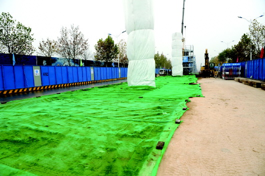 2015年11月,在济南西郊地铁R1线施工现场,工地用防尘网遮盖土地,防止扬尘。(资料片) 本报记者 周青先 摄