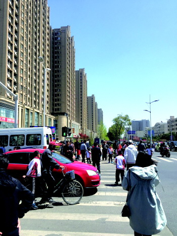 泰安路与威海路交会处的路口,均有斑马线。但不少住在富和二区的家长,为了抄近路、抢时间,而选择从靠近小区门处的马路上横穿而过。