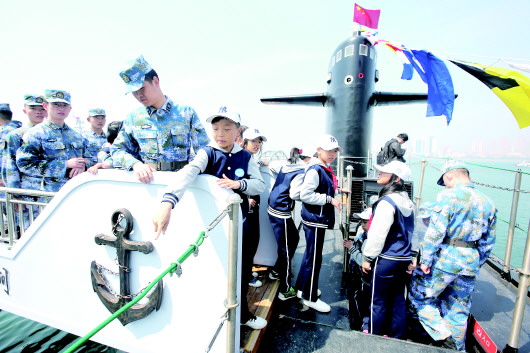 23日,小学生在长征一号核潜艇上参观。 本报记者 张晓鹏 摄