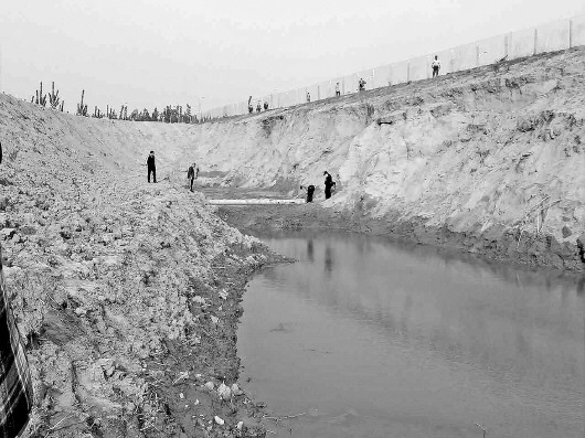 图为事发现场,位于宋家庄村附近的一个水坑。警方在此处寻找打捞失踪的两个孩子。 本报记者 张爽 摄