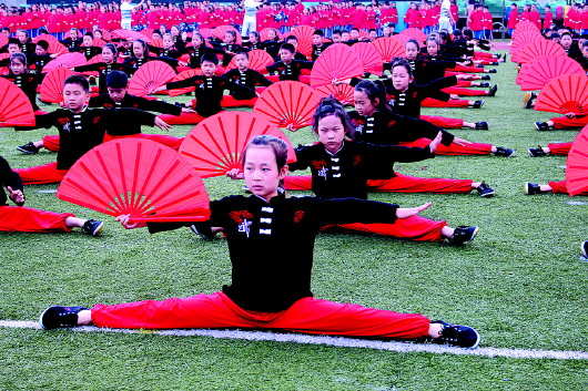5月4日,济南市市中区承办的“第十届全国学校体育联盟(教学改革)现场展示暨研讨会”举行。开幕式上,市中区学校的学子展示“集团化办学”体育成果。 本报记者 李飞 摄影报道