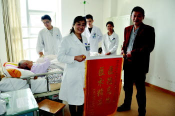 市北区人民医院内四科病房近日出现十分温馨的一幕,90岁高龄的赵亦勤老太太及亲属,将一面闪烁着“医德高尚,医术精湛”八个金字的锦旗送给了内四科林海玲主任,用以表达对该科全体医护人员医德、医术的由衷褒奖。