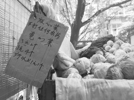 崔成(化名)今年48岁,家在仲宫,崔成在家里种了3亩半地,今年全部种的是卷心菜,亩产7000斤左右。“收成是不错,可也不知道咋回事,卷心菜出奇地便宜,批发价1毛都没人要。”崔成说,批发卖不上价,他就只好出来摆摊卖。