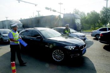 17日清晨,在聊阳路执法站,东昌府大队民警针对涉牌涉证、农用车非法载人等各种交通违法行为展开严查。7时许,对执勤民警接到查缉布控平台报警,一辆疑似套牌黑色宝马车即将由北向南驶过。发现该车辆后,民警立即准备对该车拦下进行检查。就在准备拦下该车的时候,该辆黑色宝马车驾驶员试图向右变更车道行驶,民警立即上前将该车拦下。