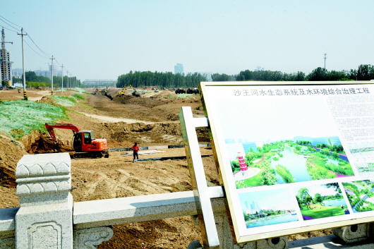 5月18日,沙王河水生态系统综合治理的施工现场一片忙碌,施工设备正在对河道进行改造施工,施工现场效果图上的美景指日可待。
