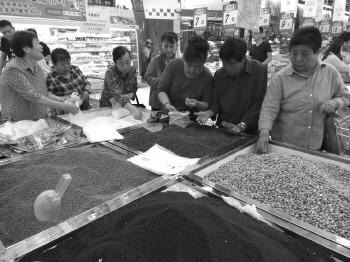 24日,记者在济宁大润发超市看到,专门有一块区域是自制粽子原材料的供应区,从江米、绿豆、红枣、白砂糖到葡萄干、蜜枣、红豆……十几种原材料可供选择。现场十分热闹,基本上以中老年和年轻妈妈为主。