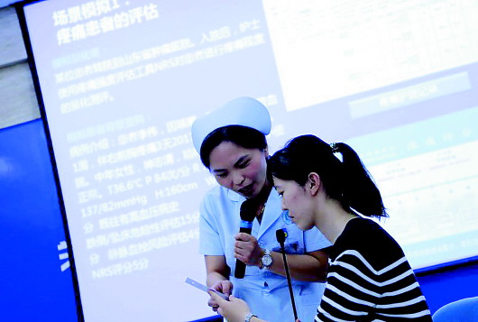 5月24日,在山东省肿瘤医院举行的“蔚蓝丝带”大型公益活动中,医护人员模拟演示如何进行癌痛评估。