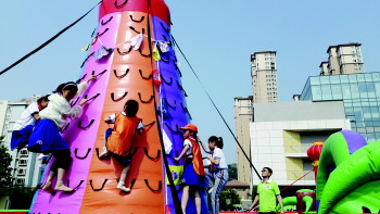 青岛市第二实验小学的学生在攀岩。