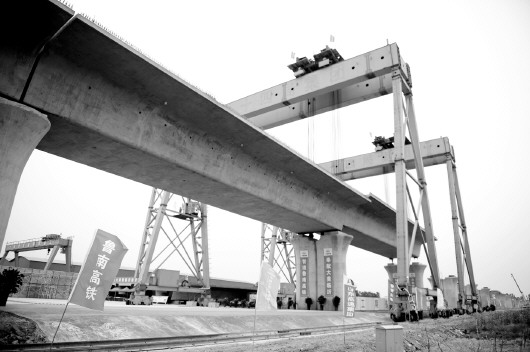 5日,鲁南高铁首孔箱梁吊装成功。 本报记者 戴伟 摄
