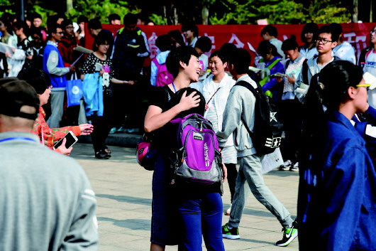 德州一中考点带队老师拥抱考生 进行鼓励。