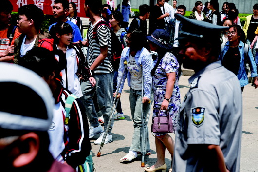 ◤考前意外受伤的考生,拄着拐杖参加考试。