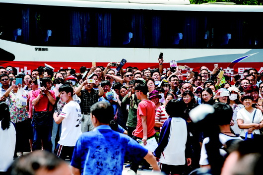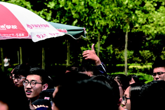 考点外的家长头顶烈日,高举手机 等待走出考场的考生。
