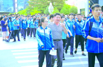 在实验高中考点,一对父女随着考生大流走出来。本报记者 匡璇 摄
