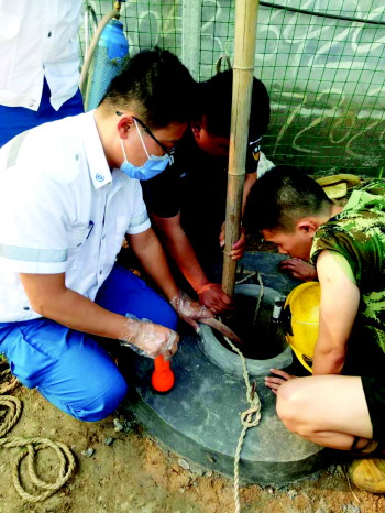 “因孩子太小,不懂得用绳救护自己,暂时无法营救。听见机井里传来孩子持续不断的哭声,家长更是乱作一团了。”任城区人民医院院前急救医生姚行廷第一时间到达现场,通过手电照明,能看到孩子头在水面露着,冻得直哆嗦。机井口直径在40厘米左右,水面以上有4米多深,成人根本无法下去。担心孩子井下缺氧窒息,急救人员迅速从车上取下氧气瓶,用直径2公分的细软管伸到井下给孩子供氧,护士肖英博跪在井沿上对孩子大声喊话,减轻孩子的恐惧心理。