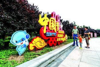 围绕新世纪广场,济宁高新区打造社会主义核心价值观主题广场,以中国传统文化元素为要旨,让游客在休闲娱乐中陶冶情操,打造主题鲜明、特色凸显的精神文明建设新阵地。图为两位老人为孩子介绍“中国梦”含义。