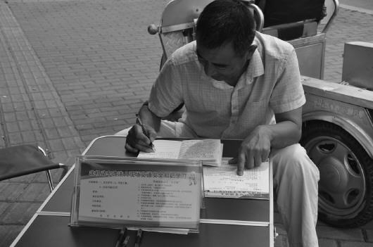 13日中午,市民姜先生骑电动三轮车带着女儿、外孙经过黄河二路、新立河东路路口时,因不按规定信号灯行驶,被在场执勤的经济开发区交警“请”到了路边,罚抄写一遍“驾驶非机动车‘十不准’”。抄写过程中,姜先生说,三种处罚方式自己选择了抄写交通法规,“印象深刻”,其中一条“不准骑车载人(限载一名十二周岁以下未成年人)”自己以前还真不了解。非机动车交通违法行为人可选择接受罚款、协助指挥交通或抄写交通法规中的一项。