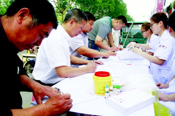14日一大早,在主题为“无偿献血倡导城市文明”的签名板上,参与无偿献血的市民纷纷签名。聊城市中心血站今年在献血日活动的基础上,结合了全市正在开展的“创建全国文明城市”活动,在主会场设置了主题为“践行社会主义核心价值观,共建全国文明城市,无偿献血,倡导城市文明”的签名布景板,供无偿献血者、志愿者和过往市民签名,希望通过我们这次的公益行动,影响和带动更多的人关注无偿献血、参与文明创建。