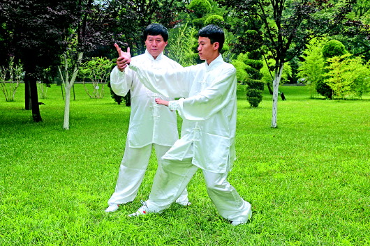 练静功缠丝太极拳首先是打基本功,然后再蹲马步、走行步、弓步、压腿抻筋。陈飞龙说,当年他光基本功就练了两三年,“父亲摸着我身体就知道我偷没偷懒,就说走行步,是平起平放,就是为了磨膝磨踝。”