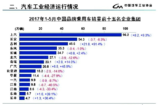 中汽协的数据显示,今年一季度,除吉利和广汽增幅较高外,长安和东风均较平稳,分别增长6.8%和9.1%。今年前5个月,中国品牌乘用车市场占有率为44.4%,较去年同期增长了1.1个百分点。
