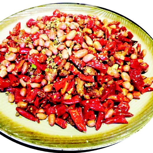 据经理介绍此菜用料特别讲究,主料选用的是南山放养的土仔公鸡现杀现烹,以保持鲜嫩肥美,辅料选用上等辣椒,这样烹出的菜品,香气四溢,诱人食欲,麻辣酥香,鲜嫩化渣。这道菜很考验厨师的功力,尤其是对火候的把握,上乘的辣子鸡必须色泽鲜艳,与辣椒交相辉映、不能发黑,鸡块必须入口酥脆、带有干辣椒过油的清香,香咸适口。火候非常难掌握,可以说是“多一分则焦,少一分则不熟”。麻辣椒香的歌乐山辣子鸡,就像看到热情奔放的她,令人回味悠长。