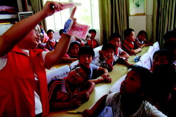 金融知识进校园,志愿者向小学生们讲解人民币知识。