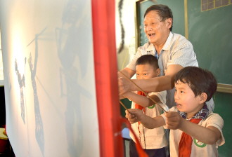 5月31日,枣庄三十三中学生们在“邢氏皮影”传承人邢如雨的指导下练习挑皮影。当日,该校邀请当地非遗传人走进校园,让孩子们学习身边的“非遗”。 (刘明祥 满成飞 摄)