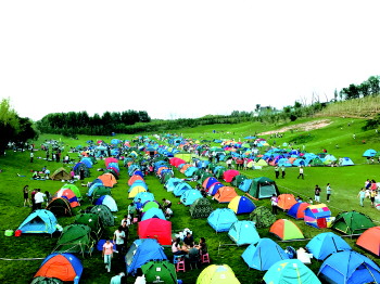 现场还有篝火晚会、露天电影,让游客们兴奋不已。玩累了,钻进帐篷,仰望星空,数着星星,进入梦乡。第二天早上,特邀瑜伽师推出的“千人瑜伽”专场,让游客们来了次彻底放松。游客们舒展身体,享受心灵的喜悦与宁静。“太高大上了,真是不虚此行。”一名游客说。