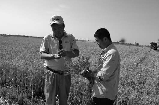 姜国青(左)在查看麦粒饱满情况。