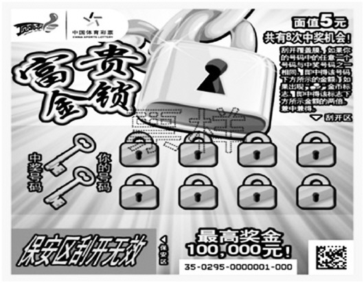 同步推出的还有5元新票“富贵金锁”,“富贵金锁”在设计风格上简单大气,每张彩票有8次中奖机会,最高可中10万元。游戏设计上:刮开覆盖膜,如果你的号码中的任意一个号码与中奖号码之一相同,即中得该号码下方所示的金额;如果出现“金币”标志,即中得该标志下方所示金额的两倍。兼中兼得。