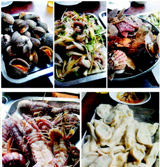 船上的饭菜最大的特点就是新鲜。新打上来的鱼宰杀干净,就用海水直接炖熟,一概不放调料,只加一点盐,真正的原汁原味,只有鱼本真的鲜美,毫无任何虚饰,却令人心醉;新捕获的鱼、螃蟹、虾、蛤蜊、皮皮虾等海水炖煮,味道极其鲜美,很难用具体的文字描述。