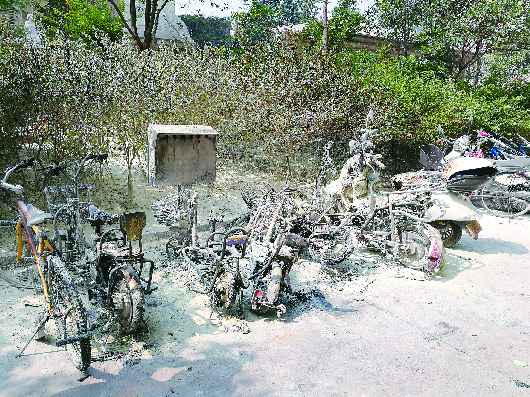 ▲事发现场,数辆电动车和摩托车被烧毁。