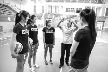 女排队员切磋传球技术。