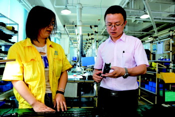科力光电总经理李海明(右)检测产品。 本报通讯员 吴井山 摄