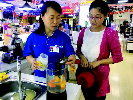 一杯杯鲜美的果汁、菜汁,加上销售人员热情的品尝邀请,让记者无法拒绝。在小家电区域转了一圈,豆浆、南瓜汁、山药养生汁、新煮制的花茶、蛋糕等美食尝了个遍,也对时尚新款小家电有了全面的了解。