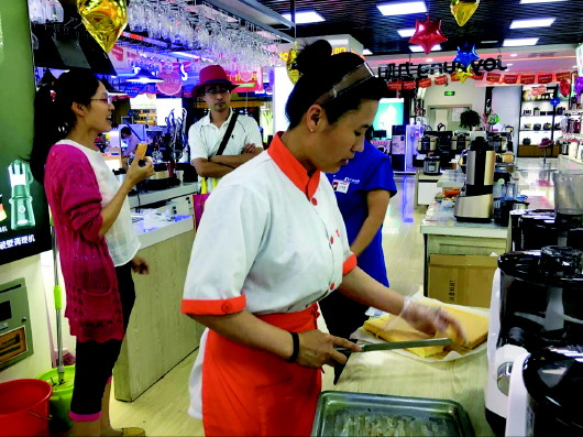 “每周六,在我们的展示区内,工作人员会现场传授烘焙秘诀,大家都可以来学习,还能尽情品尝,很受家庭主妇们的欢迎”,销售人员介绍。