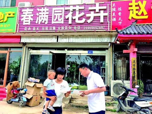工作人员正在派发关于创业担保贷款的传单。