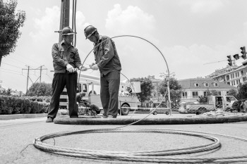 嘉祥供电施工人员检修线路。 本报通讯员 王者东 摄