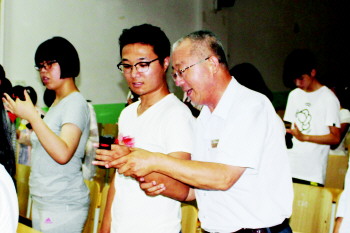 李贵才(右)在给学生纠正手形。