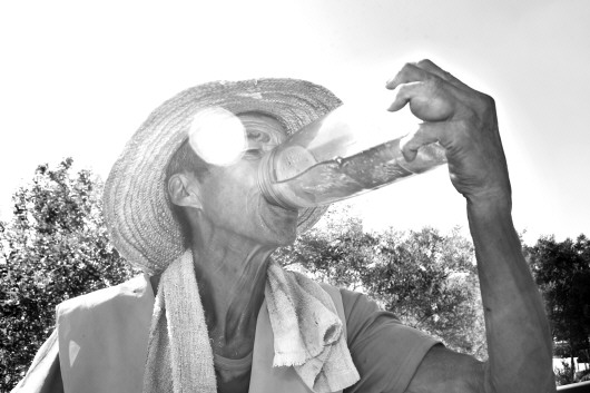 为了防止中暑,侯自喜们只能不断的喝水。该工程共有20余名工人,粗略计算,每人每天得喝下10余斤水。“每天早上6点到上午11点半,下午1点到晚上6点半,一天至少工作10个小时,已经习惯了。”侯自喜说。